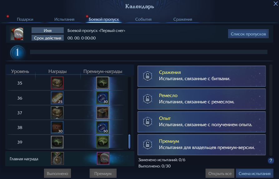Загляните в «Календарь» ⇒ «Боевой пропуск» и найдите в списке «Первый снег». Для активации события вам понадобится 100 золотых, но затраты быстро окупятся благодаря наградам за выполненные задания и бонусам за уровни. Вы сможете получить уникального фамильяра Снолле, титул VIII ранга «Не спи, замерзнешь!», заговоренную гадальную руну и множество других полезных предметов.